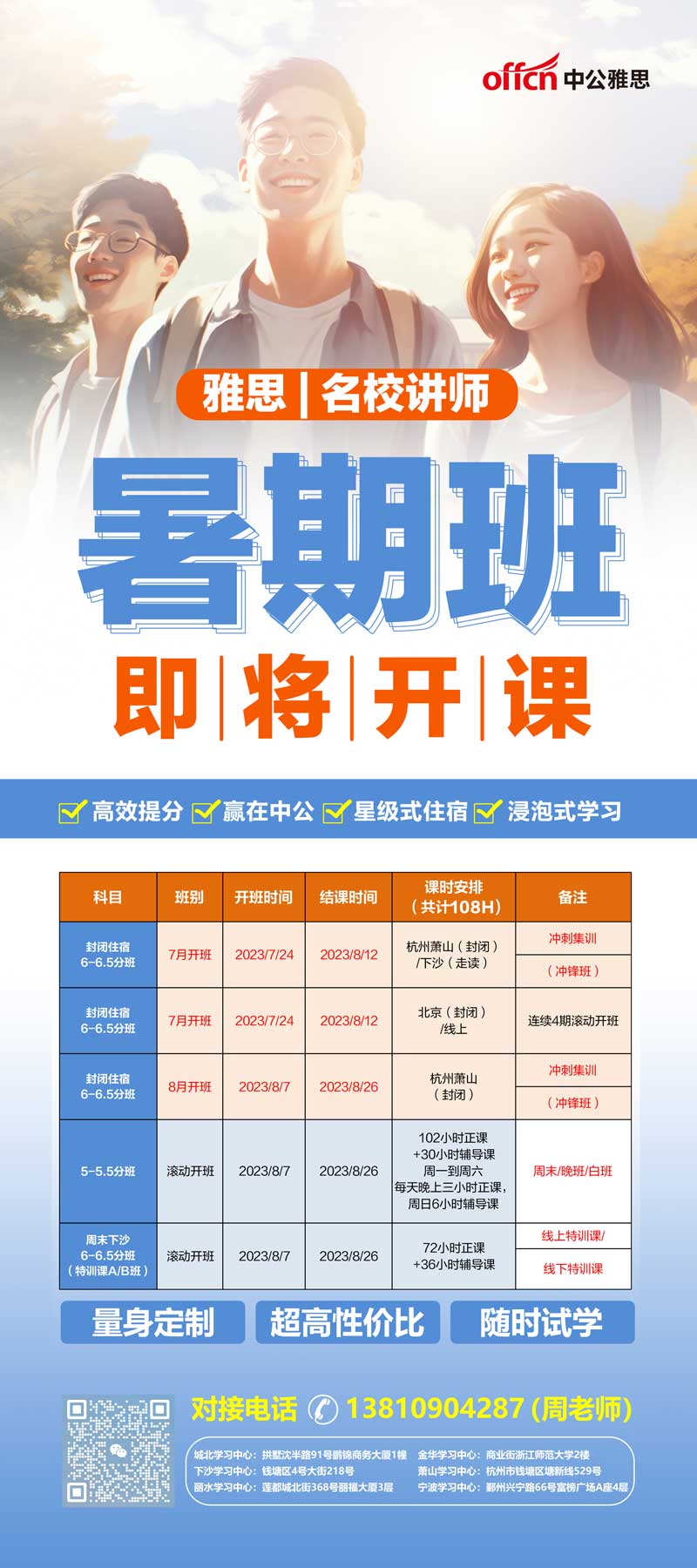 但想提高雅思分數難度還是比較大的,如果僅憑自學,更是難度驟增。在此情況下,想盡快提高分數,選擇適合的培訓班就顯得尤為重要,下面為大家介紹7月份浙江雅思集訓班: